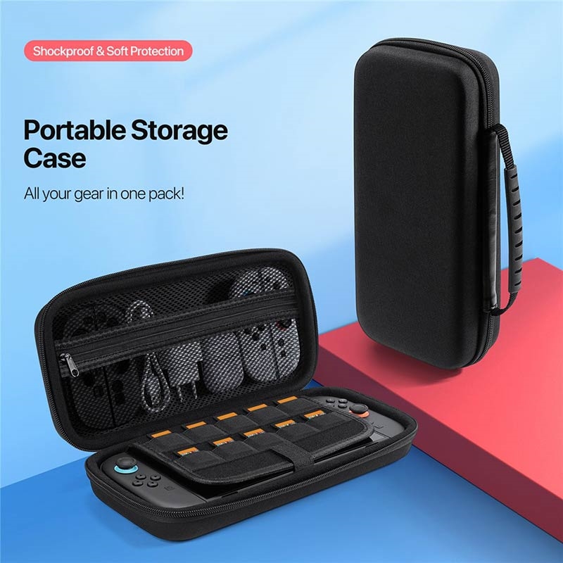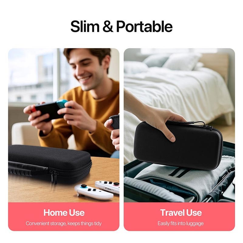 Skydda och organisera din konsol och dina tillbehör vart du än går med denna slimmade, stötdämpande förvaringsväska i klassisk svart.