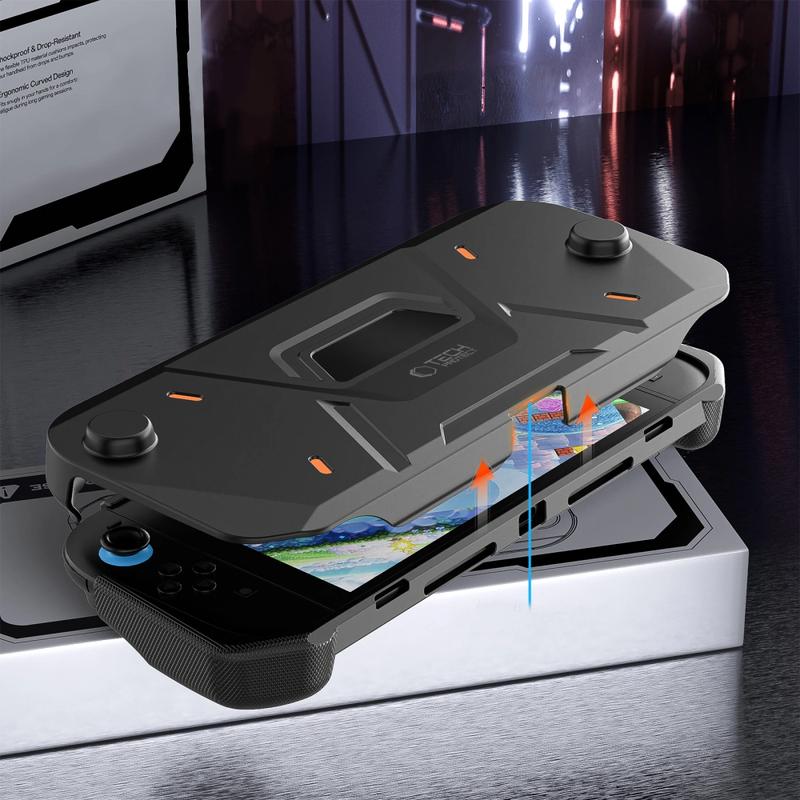 Ge din Nintendo Switch 2 samma robusta skydd som smartphones i toppklass. Tech-Protect Carbonox omsluter hela konsolen i ett stötdämpande skal som skyddar Joy-Cons, sticks och skärm från fall, repor och ryggsäckstryck. En avtagbar frontplatta kan tas bort i en rörelse för handhållet spel eller dockning, och klickas sedan på igen för säker resa - du behöver inte ta bort hela fodralet. Värmeavledande ventiler och ett ergonomiskt bakre grepp håller maratonspelsessioner svala och bekväma.