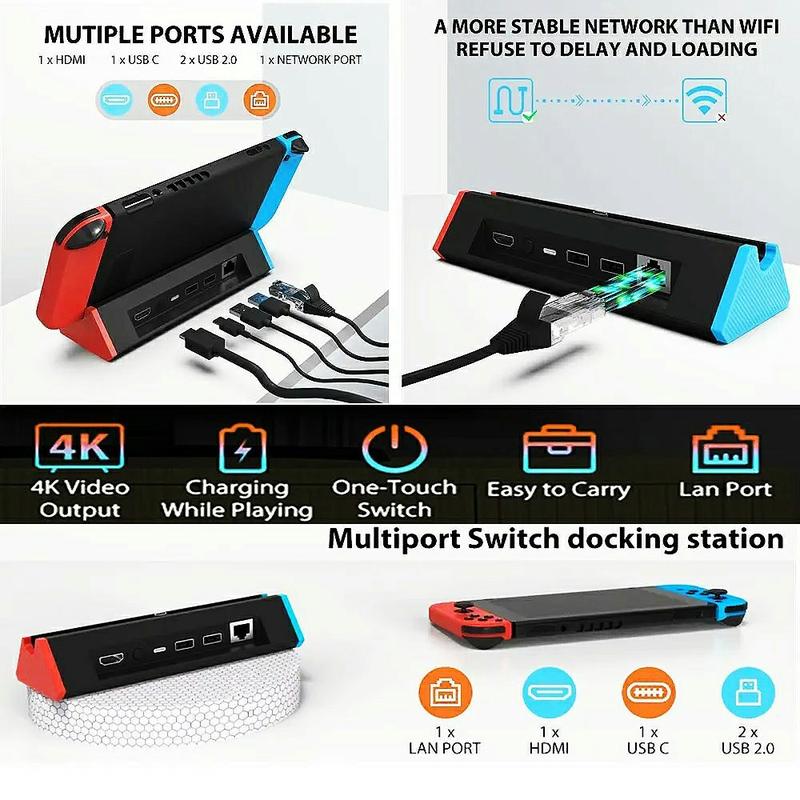 Uppgradera din speluppsättning med Nintendo Switch 2 Docking Station, utformad för fantastiska bilder och mångsidig anslutning. Med stöd för upp till 4K vid 120Hz-utgång garanterar denna docka smidigt, högupplöst spel på kompatibla skärmar. Med inbyggda HDMI 2.1-, USB 3.0-, Type-C- och RJ45-portar ger den en komplett hubblösning för spel, streaming och snabba onlineanslutningar. Den kompakta och bärbara designen gör den perfekt för både heminredning och resor, och ger den ultimata blandningen av prestanda och bekvämlighet.