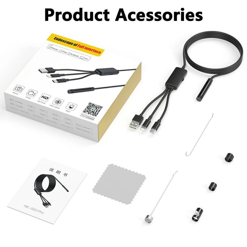 NK-5001Pro 3-i-1 vattentät IP67 inspektionskamera/endoskop för iPhone/Smartphone, iPad/Tablet - Lightning, USB-C, USB - 5m, 1080p/720p