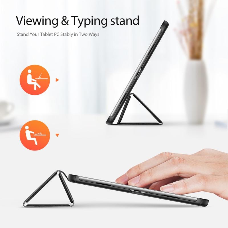 Detta tillbehör håller enheten skyddad mot stötar och repor, samt expanderar dess funktionalitet. Framluckan fungerar också som ett stativ med tre lägen för enkel skrift och handsfree videovisning.