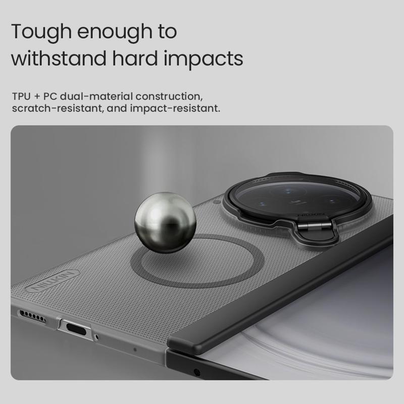 Skydda din Oppo Find N6 med stil med Nillkin Super Frosted Shield Prop Case. Detta slimmade men robusta mobilskal är konstruerat för hållbarhet och skyddar mot dagligt slitage samtidigt som det tillför användbar funktionalitet. Med ett praktiskt lock för kameralinsen och ett integrerat kickstand förenar det sömlöst robust skydd med modern bekvämlighet.