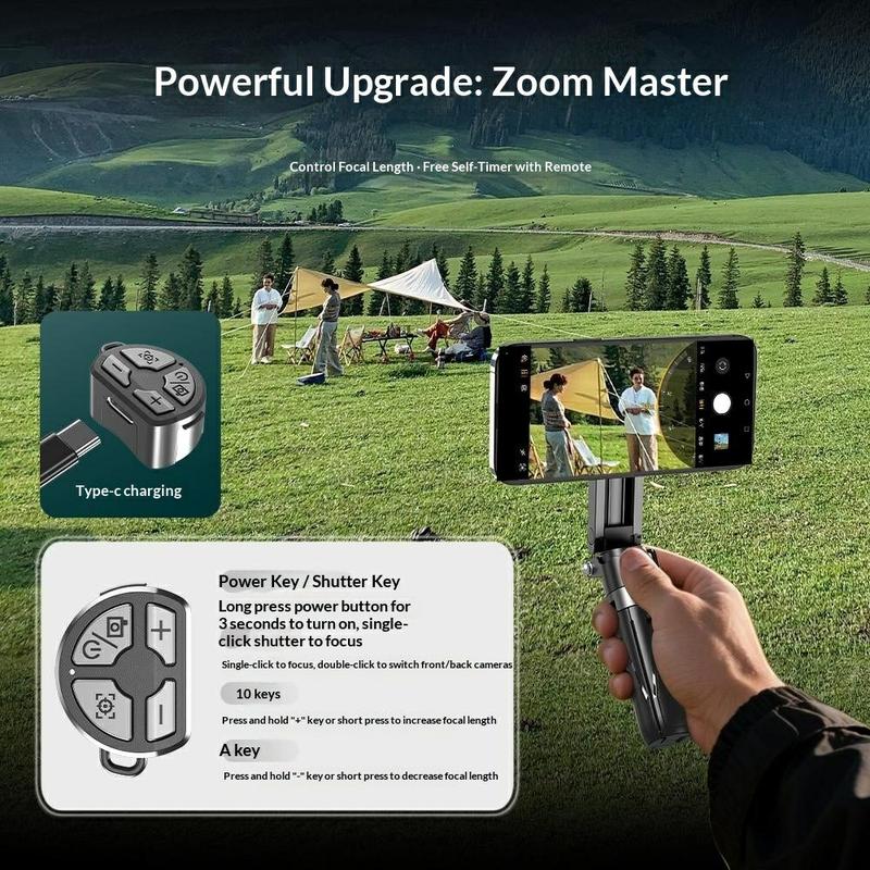 Med den medföljande Bluetooth 5.2-fjärrkontrollen kan du utlösa foton och videor från upp till 10 m avstånd. Den stöder växling mellan främre och bakre kameror, zoomning och fokusering, vilket ger dig full kontroll utan att röra telefonen.