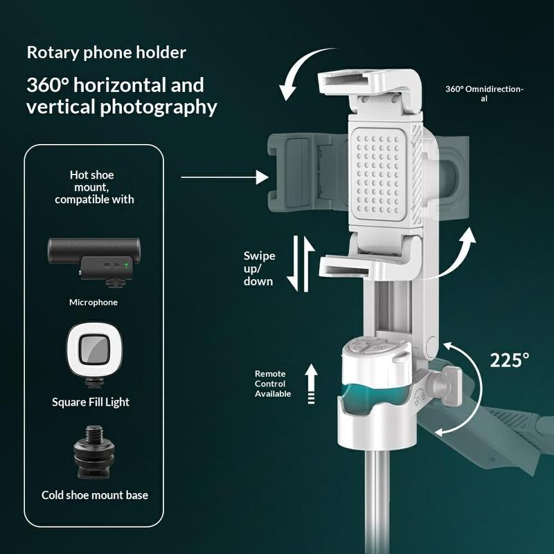 Telefonklämman stöder 360° rotation för porträtt- eller landskapsfotografering och erbjuder 225° lutningsjustering. Denna flexibilitet gör att du kan fånga kreativa vinklar för vloggar, gruppfoton och innehåll i sociala medier.
