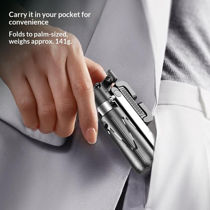 Den hopfällbara designen sträcker sig från 11,7 cm till 41,5 cm, vilket gör den enkel att förvara i en väska eller ryggsäck. Den lätta konstruktionen garanterar bekväm användning under resor och utomhusinspelningar.