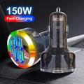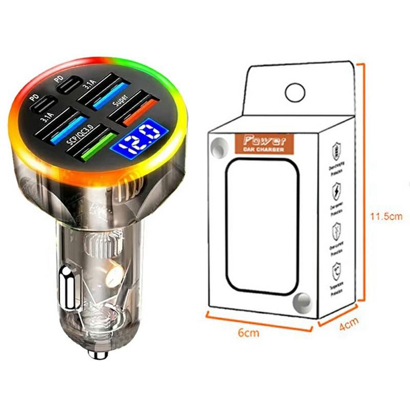 Portabel 6-portars billaddare 150W - snabbladdningsadapter med PD & QC3.0, spänningsvisning, LED-lampa, stöd för flera enheter - 2x USB-C-portar, 4x USB-A-portar