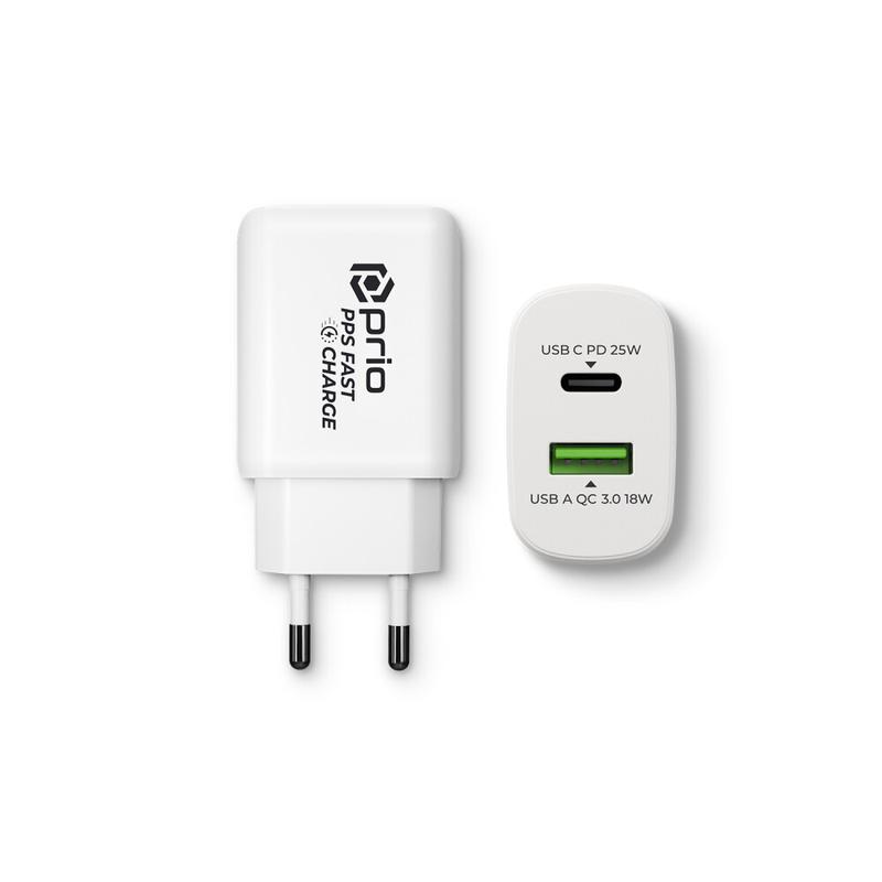 Prio PWC-1204 Snabb väggladdare med 25W PD USB-C, 18W QC3.0 USB-A-portar