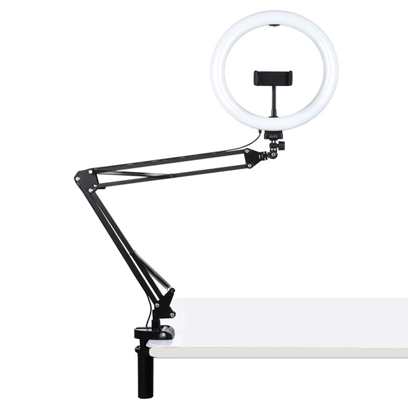 PULUZ 10.2" 26cm böjd ringlampa + USB-stativ med skrivbordsarm 3 lägen dimbar dubbel färgtemperatur LED Vlogging Selfie-fotografering Videolampor med telefonklämma
