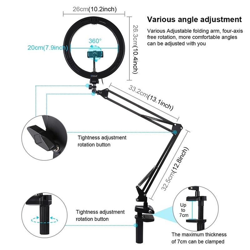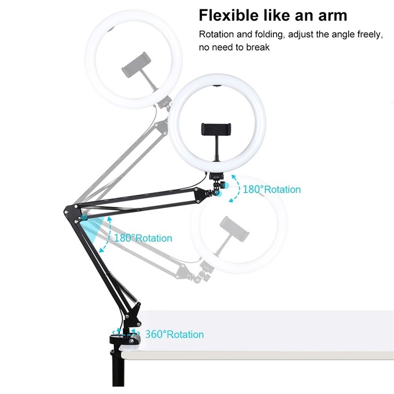 LED-ringljuset kan monteras på hållaren och tas med överallt, det kan också tas bort från stativet när som helst, stativets kulhuvud kan rotera 360 grader kan fritt justeras till valfri vinkel (hållaren ingår inte)