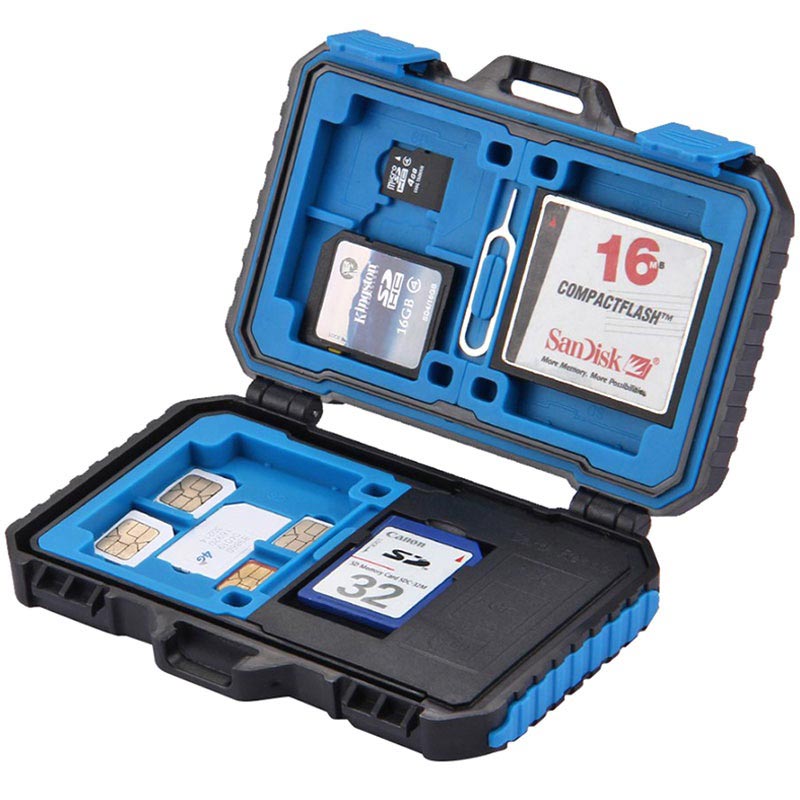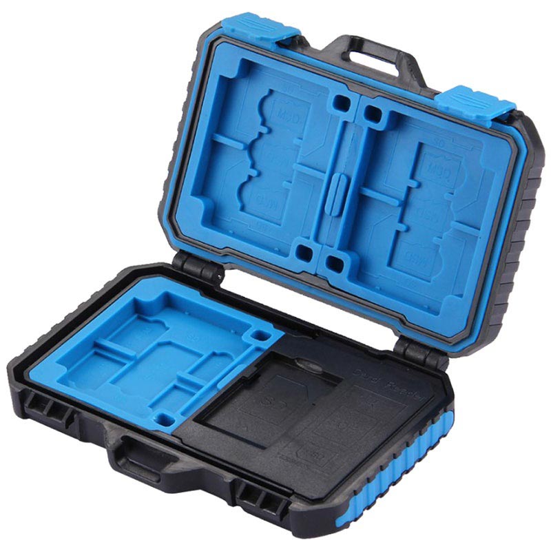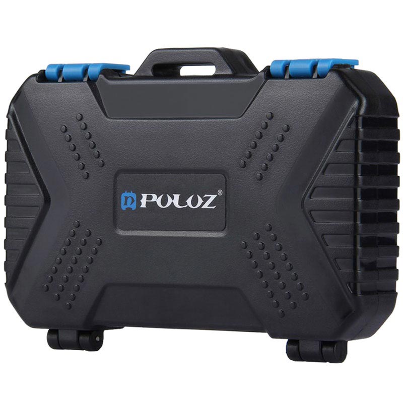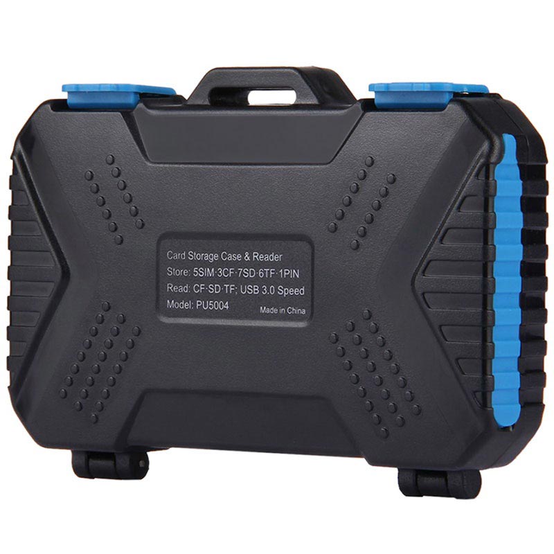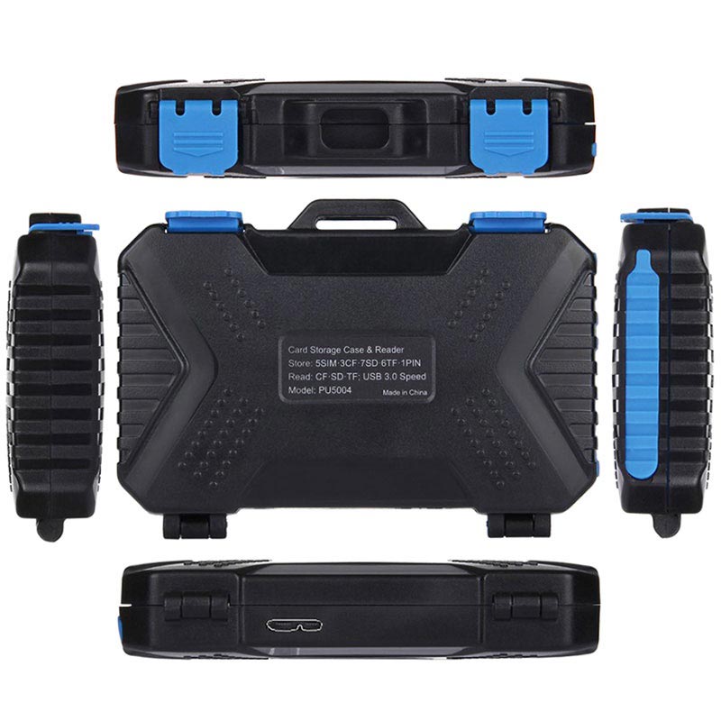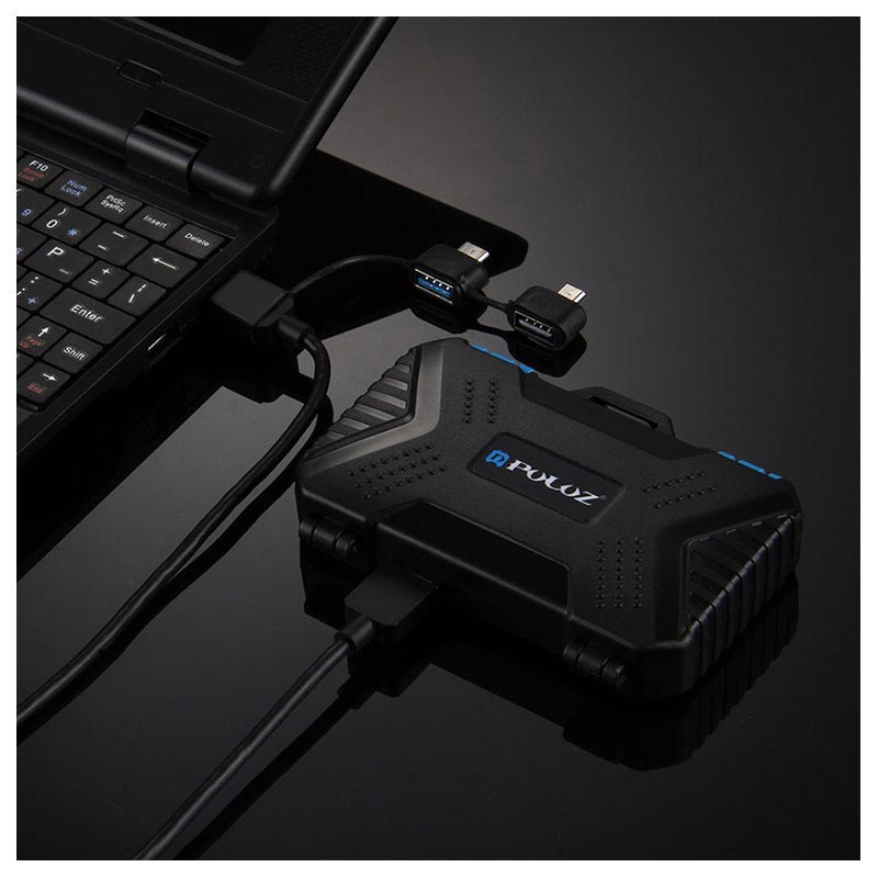 En kortläsare och förvaringsbox i ett - denna Puluz PU5004 låter dig bära upp till 22 olika SIM och minneskort och för att koppla dem till din OTG- stödjande smartphone, surfplatta, PC eller laptop. Dess lätta och kompakta design låter dig bära den med dig och ha alla kort och läsaren vid dina fingerspetsar. Rejält, slittåligt och vattentätt plastfodral som skyddar dina kort mot skador. Den kommer med en microUSB 3.0 till USB 3.0 kabel som har microUSB och Typ-C fästen.