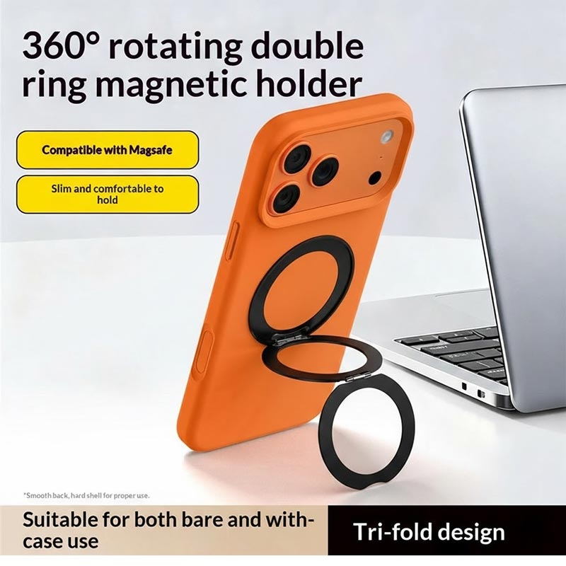 Q11 Ultratunt trippelvikbart magnetiskt ringstativ - 360° roterande självhäftande telefonhållare, MagSafe-kompatibel