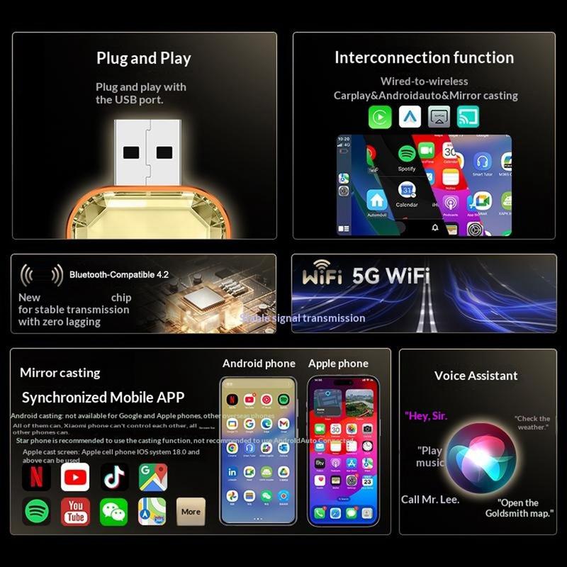 - Omvandlar trådbundet CarPlay och Android Auto till trådlöst