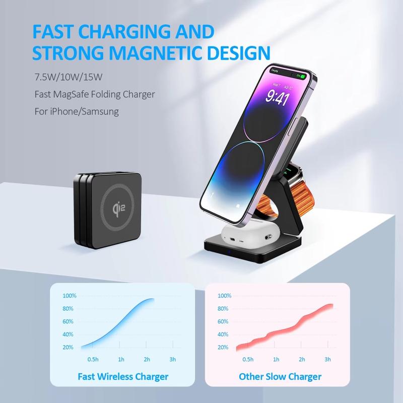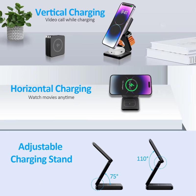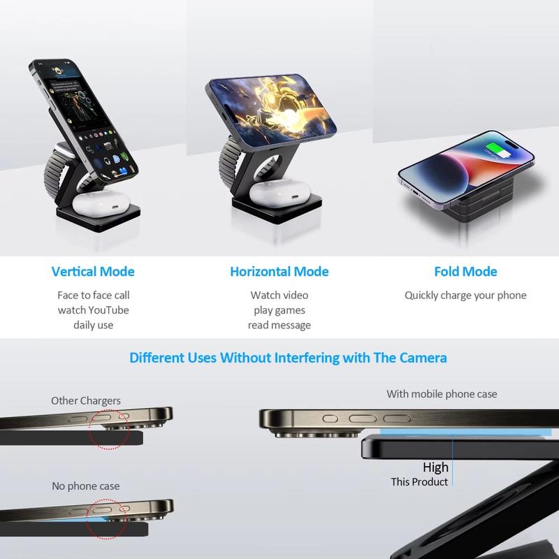 Qi2 15W 3-i-1 vikbart magnetiskt trådlöst laddningsställ - för iPhone, Apple Watch & AirPods