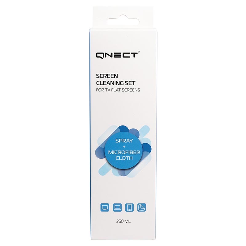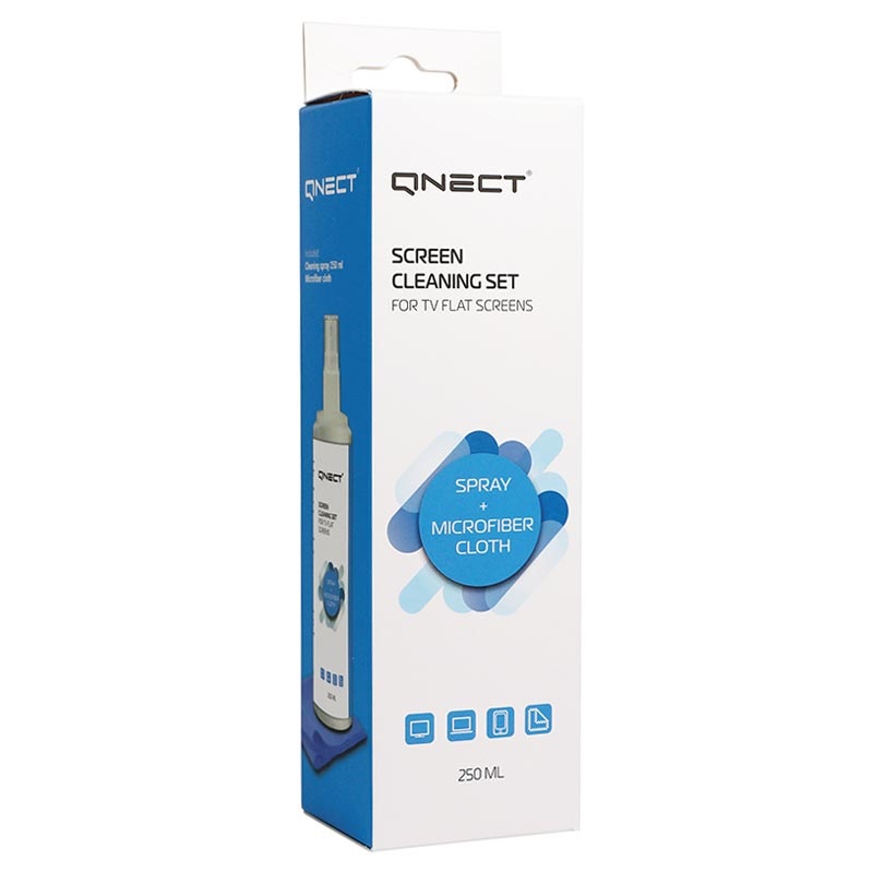 - Qnect skärmrengöring set kombinerar 250ml desinfekterigs-spray och mjuk duk