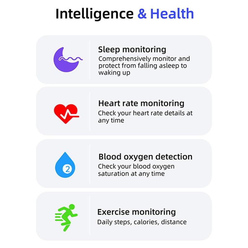 - Omfattande hälsoövervakning via Smart Health-appen - Övervakar hjärtfrekvens, syrehalt i blodet, sömnkvalitet och aktivitetsnivåer.