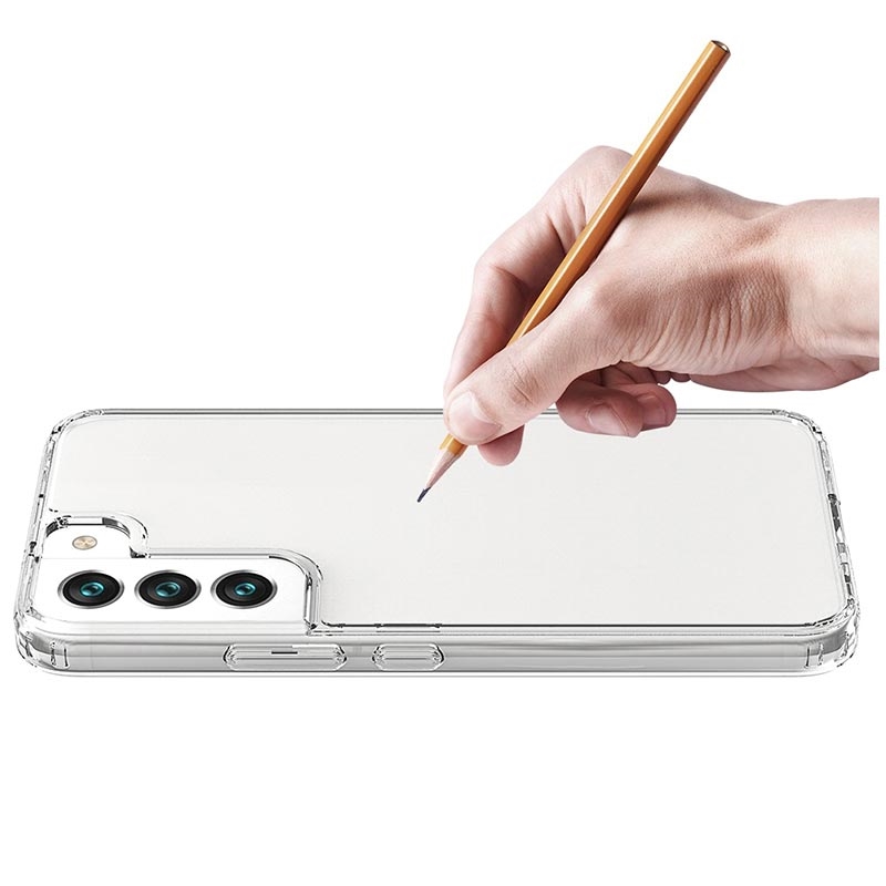 Tack vare designen med dubbla lager som kombinerar kristallklart akrylmaterial och mjuka TPU-kanter kommer detta tunna Samsung Galaxy S22 5G skal förhindra skador som kan uppstå vid vardaglig användning. Skalet är lätt och känns utmärkt i din hand. Gjutna knappar som är enkla att trycka på och utskärningar för portar möjliggör enkel hantering av din smartphone, som om inget skal ens skulle sitta på.