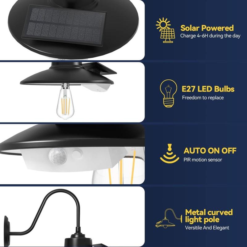 Retro solcellslampa med Edison LED och rörelsesensor - 3-modig IP65 vägglampa för utomhusbruk