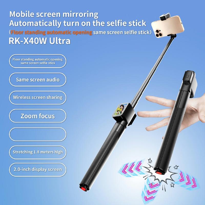 RK-X40W Ultra Smartphone Selfie Stick & Tripod med Auto Pop-Open-stativ, 2,0-tums skärmspegling, WiFi & Bluetooth