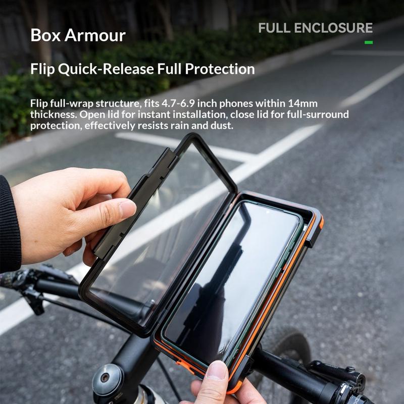 Kör med din telefon skyddad och lätt att se med ROCKBROS vattentäta magnetiska telefonhållare för styret. Den är konstruerad för cyklar och elcyklar och kombinerar en flip-cover-tätningsdesign med IPX4-vattentålighet för att skydda din telefon från regn och stänk från vägen. En stark magnetmodul och en halkfri silikonkudde ger snabb montering och stabilt grepp, medan kulledskonstruktionen gör att du kan rotera skärmen 360 grader för bästa betraktningsvinkel. Speciella öppningar gör det möjligt att ladda och använda kameran under cyklingen.