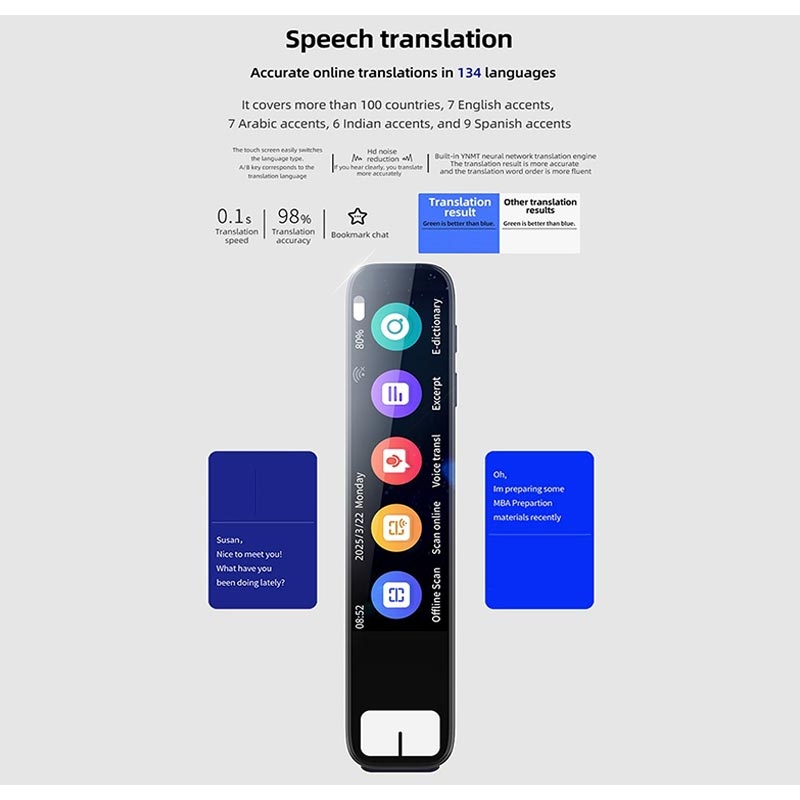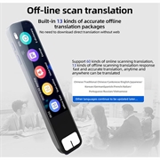 Fotoöversättning använder OCR-teknik (optisk teckenigenkänning) för att skanna och omedelbart översätta text från bilder, vilket gör det särskilt användbart för att läsa skyltar, menyer eller dokument när du är på resande fot. Röstöversättning till 134 språk gör också S08B till en av de mest mångsidiga handhållna översättarna som finns.