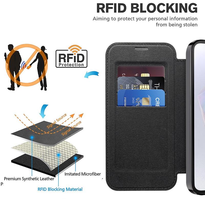 - Funktioner: Kortplats, stark magnet för automatisk stängning, RFID-blockeringsteknik, inbyggd magnetring