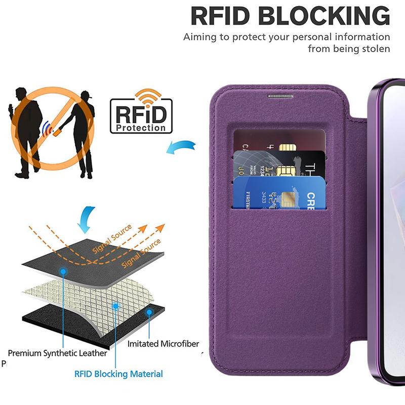 Detta premiumfodral till Samsung Galaxy A35 är tillverkat av högkvalitativ TPU, akryl och polyuretan, med en fin process för att säkerställa en känslig och utsökt finish. Det är utrustat med en praktisk kortplats för enkel svepning och utlägg på språng, och har en stark magnet för automatisk stängning, vilket gör det säkert och bekvämt att hantera föremål inuti. Detta Samsung Galaxy A35-fodral ger ett effektivt skydd mot dagligt slitage, repor, märken och skrapsår, medan den avancerade RFID-blockeringstekniken i kortfacket ser till att din personliga information skyddas mot stöld. Den inbyggda magnetringen är dessutom kompatibel med MagSafe trådlös laddning, vilket innebär att du kan ladda din Samsung Galaxy A35 utan att ta av dig fodralet.