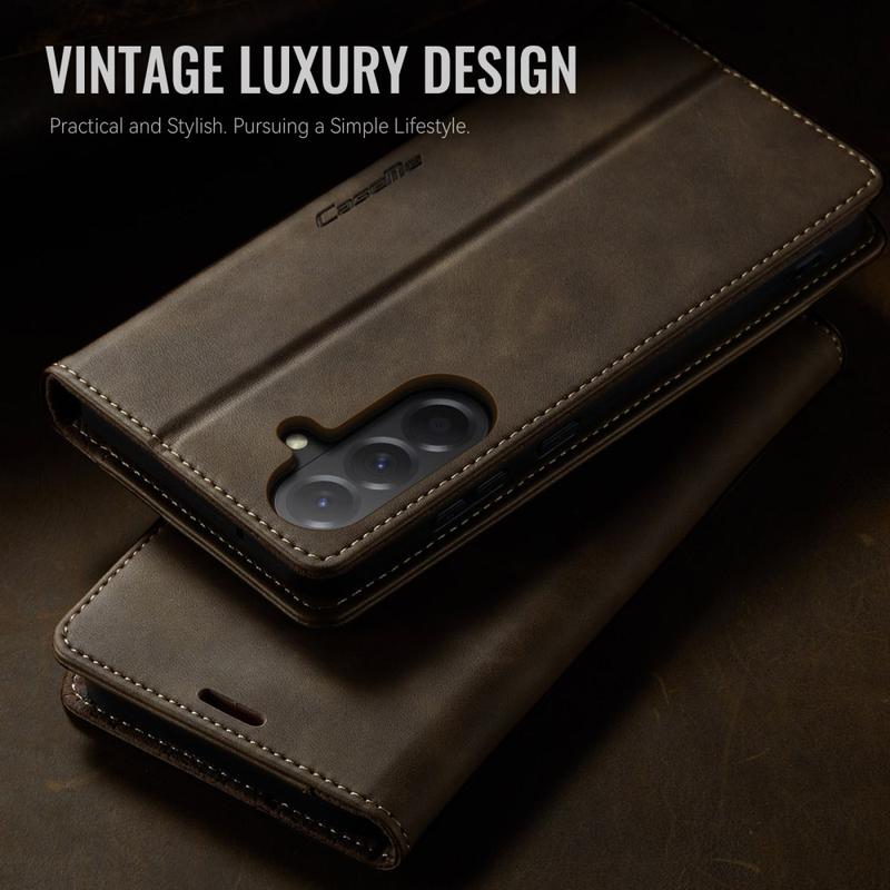 CASEME 033 Series Wallet Case för Samsung Galaxy A57 är tillverkat av polyuretan med kalvtextur kombinerat med TPU, vilket ger ett helkroppsskydd mot repor, stötar och dagligt slitage samtidigt som det bibehåller en premium, elegant look.