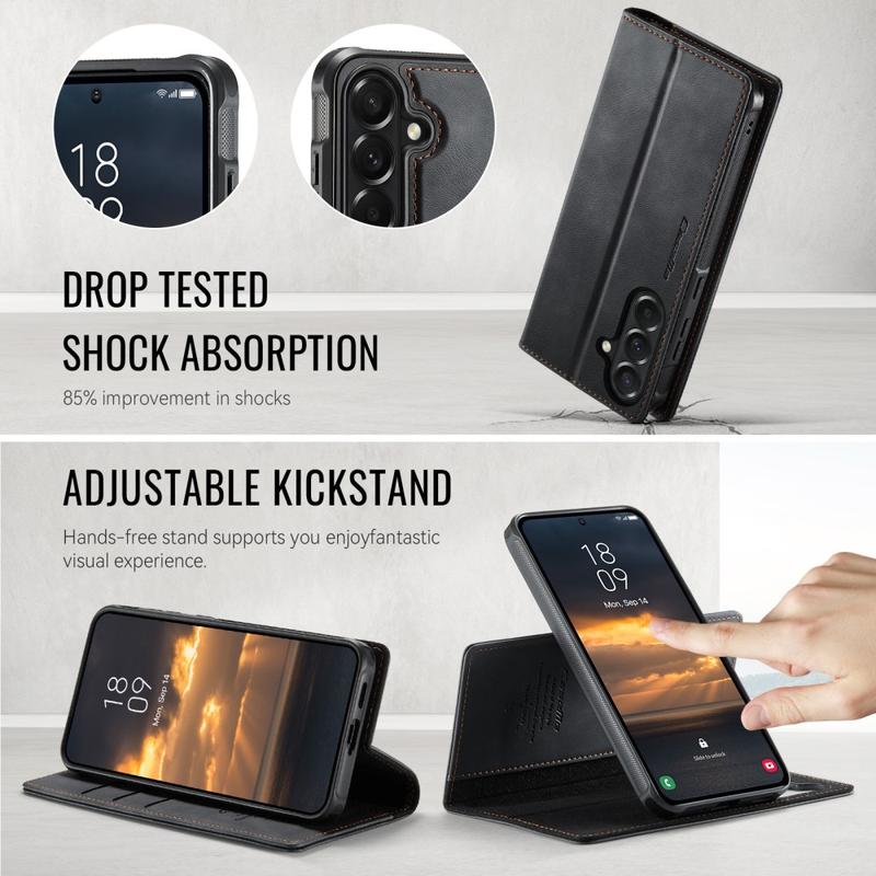 CaseMe C49 Wallet Case för Samsung Galaxy A57 är tillverkat av slitstark TPU och polyuretan, vilket ger ett bekvämt grepp och tillförlitligt skydd mot vardagliga stötar, fall och repor. På insidan finns ett mjukt mikrofiberfoder som ser till att din enhet förblir orörd.