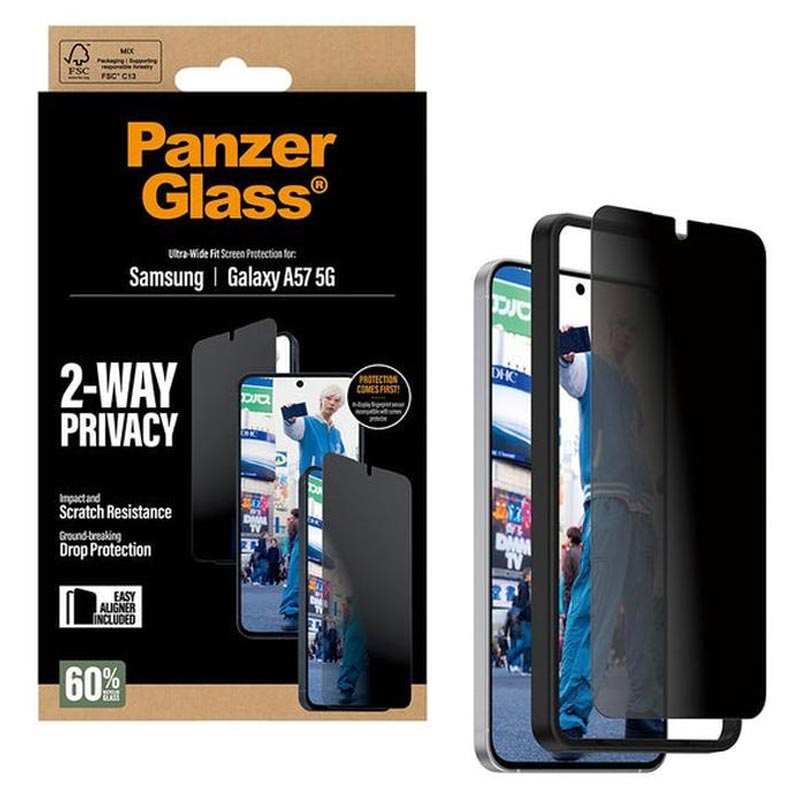 - PanzerGlass Ultra-Wide Fit Privacy EasyAligner skärmskydd är INTE kompatibel med Samsung Galaxy A57 fingeravtryckssensor
