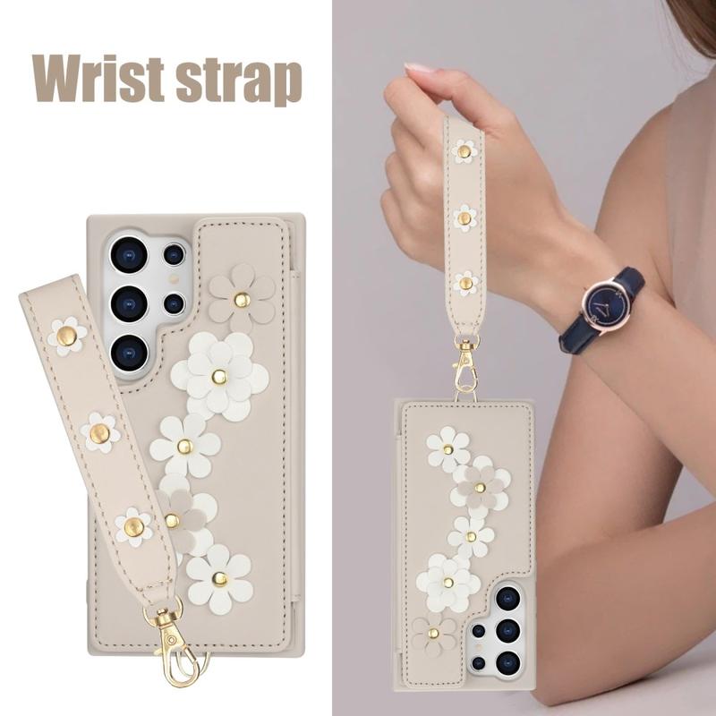 Blomsterdekorerat fodral med rem och kortfack för Samsung Galaxy S24 Ultra