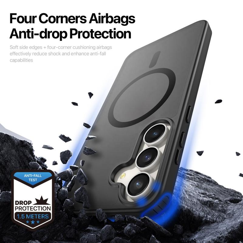 - Hybridkonstruktion: baksida i matt polykarbonat + flexibel TPU-stötfångare med hörnkrockkuddar för stötdämpning