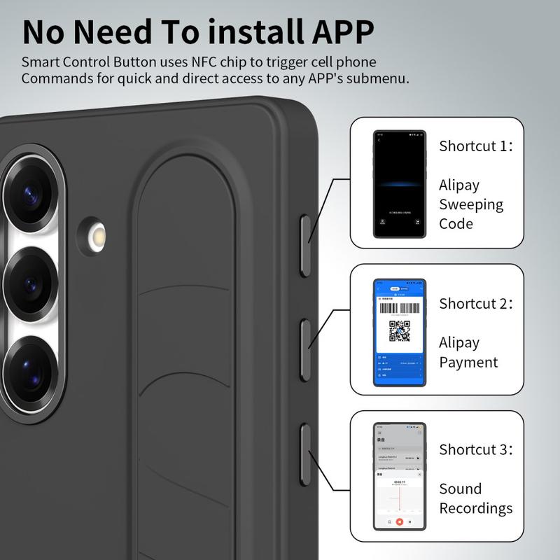 Det här smarta hybridfodralet är utrustat med tre intelligenta NFC-aktiverade knappar som gör att du kan skapa snabb åtkomst till appar som Kamera, Ficklampa eller Skärmdump med en enda tryckning. Ingen laddning, inga extra appar - bara enkel, omedelbar funktionalitet.