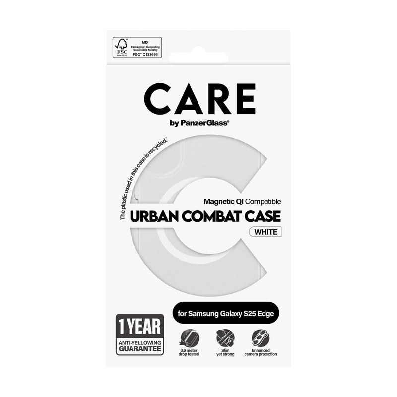 CARE by PanzerGlass Urban Combat Case är perfekt för dig som söker ett snyggt, miljövänligt och mycket skyddande fodral till din Samsung Galaxy S25 Edge. Dess militärklassade skydd, MagSafe-kompatibilitet och hållbara material gör det till ett utmärkt val för alla användare.