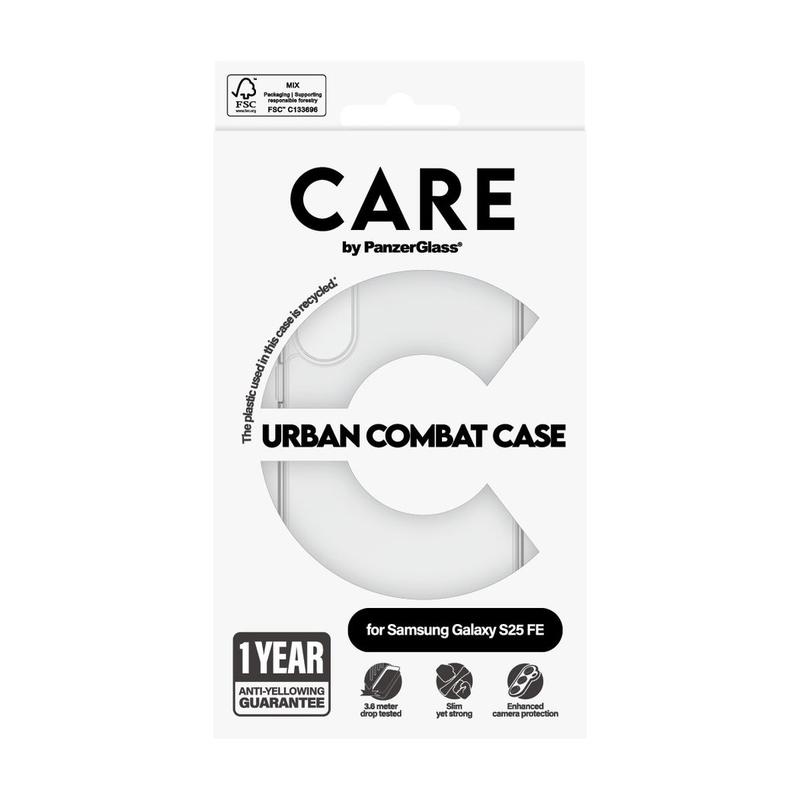 CARE by PanzerGlass Flagship Case för Samsung Galaxy S25 FE Urban Combat med Clear Frame är designat för dig som behöver ett robust skydd utan att göra avkall på stilen. Tillverkat av 100% återvunnen plast är detta fodral byggt för att klara fall upp till 4,8 meter och erbjuder förbättrad rep- och stöttålighet. Det är också kompatibelt med trådlös laddning och levereras med en 1-årig anti-gulningsgaranti.