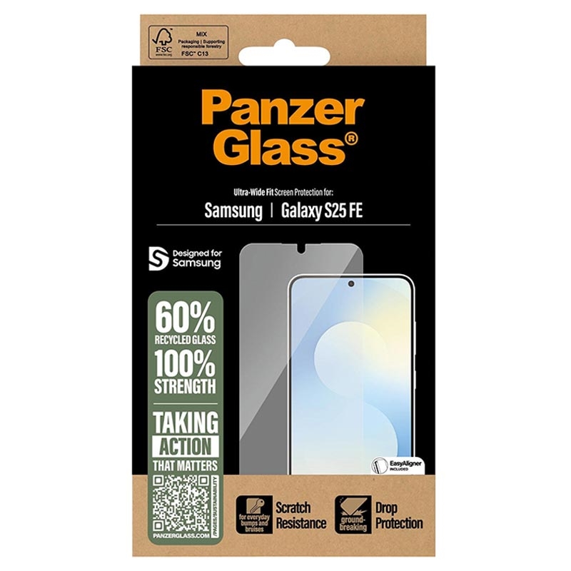 - Ultra-Wide Fit skärmskydd i härdat glas till Samsung Galaxy S25 FE av PanzerGlass