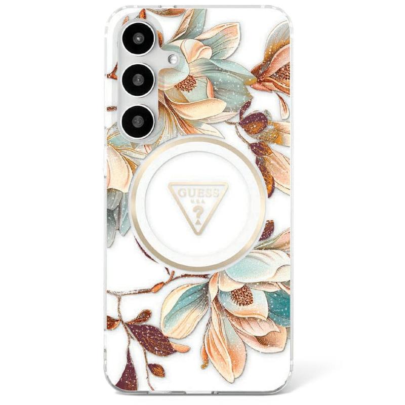 Skydda din Samsung Galaxy S25 med stil med Guess Glitter Flowers Triangle Buttons MagSafe Case, som kombinerar modern design, hållbarhet och trådlös laddning.