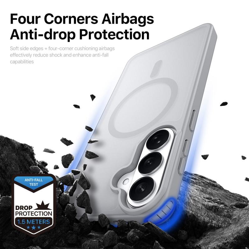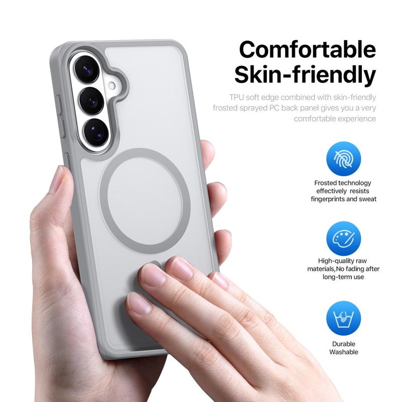 Skydda din Samsung Galaxy S26+ med ett snyggt matt skal som klickas direkt på MagSafe-laddare och tillbehör. Yind-serien kombinerar en reptålig PC-bakplatta med stötdämpande TPU-kanter och en precisionsjusterad magnetring, vilket ger kabelfri strömförsörjning och ett heltäckande fallskydd utan skrymmande fickor.