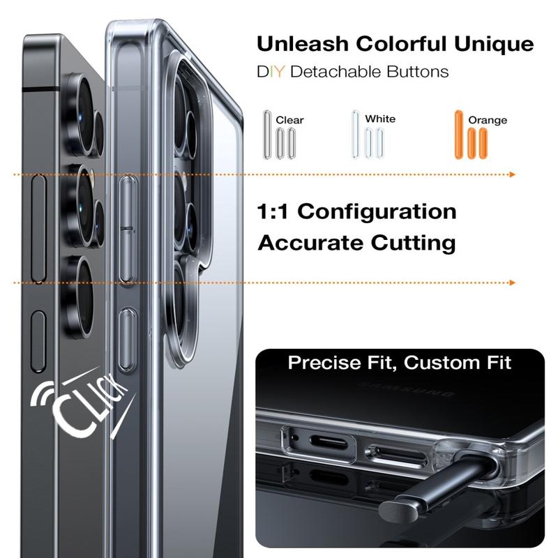 Skalet innehåller tre färguppsättningar med utbytbara knappar, vilket gör att du kan anpassa utseendet på din Samsung Galaxy S26 Ultra. Byt enkelt ut knapparna för att matcha din stil, outfit eller humör och skapa ett unikt, anpassat utseende.