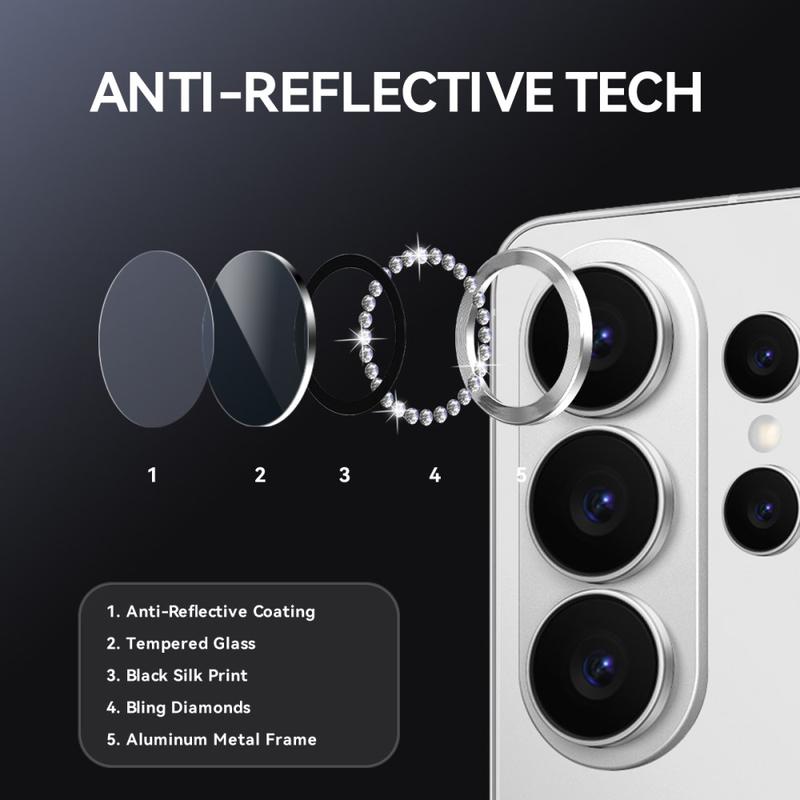 Lägg till glitter och skydd till din Samsung Galaxy S26 Ultra med NORTHJO Camera Lens Protector. Designad med skimrande strass och precisionsskuret härdat glas, håller den din kameralins säker från repor, damm och stötar samtidigt som den ger en touch av elegans och lyx.