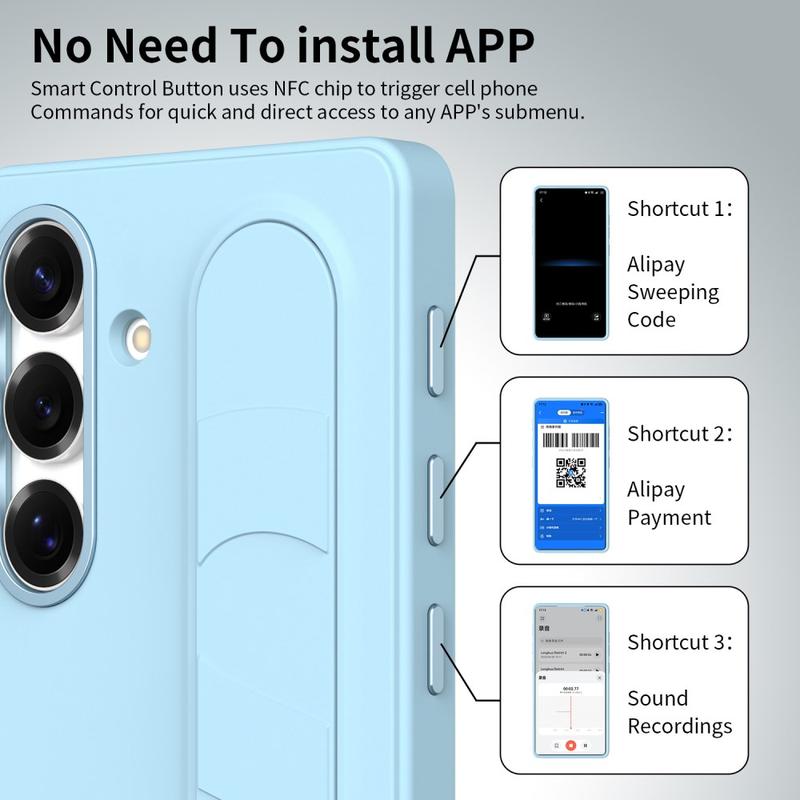 Det här smarta hybridfodralet är utrustat med tre intelligenta NFC-aktiverade knappar som gör att du kan skapa snabb åtkomst till appar som Kamera, Ficklampa eller Skärmdump med en enda tryckning. Ingen laddning, inga extra appar - bara enkel, omedelbar funktionalitet.