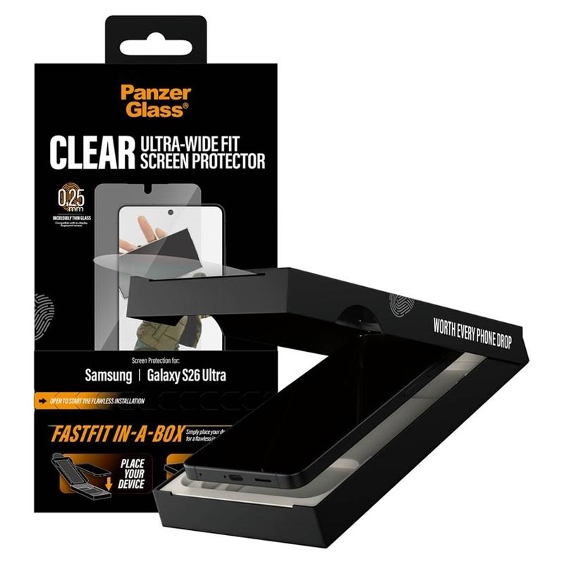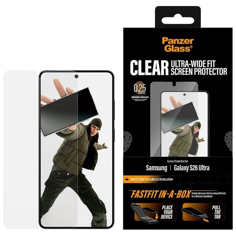 PanzerGlass Ultra-Wide Fit skärmskydd för Samsung Galaxy S26 Ultra är utformat för snabb, bubbelfri installation tack vare det innovativa FASTFIT IN-A-BOX-systemet. Placera helt enkelt din Samsung Galaxy S26 Ultra med framsidan uppåt, dra i fliken och njut av ett perfekt anpassat skydd varje gång - inget damm, ingen frustration.