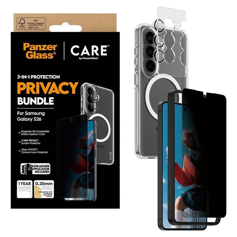Care by PanzerGlass 3-i-1-paket för Samsung Galaxy S26 - integritetsskydd för skärmen, Hoops-lins skydd, CARE Urban Combat-fodral (3,6 m), EasyAligner