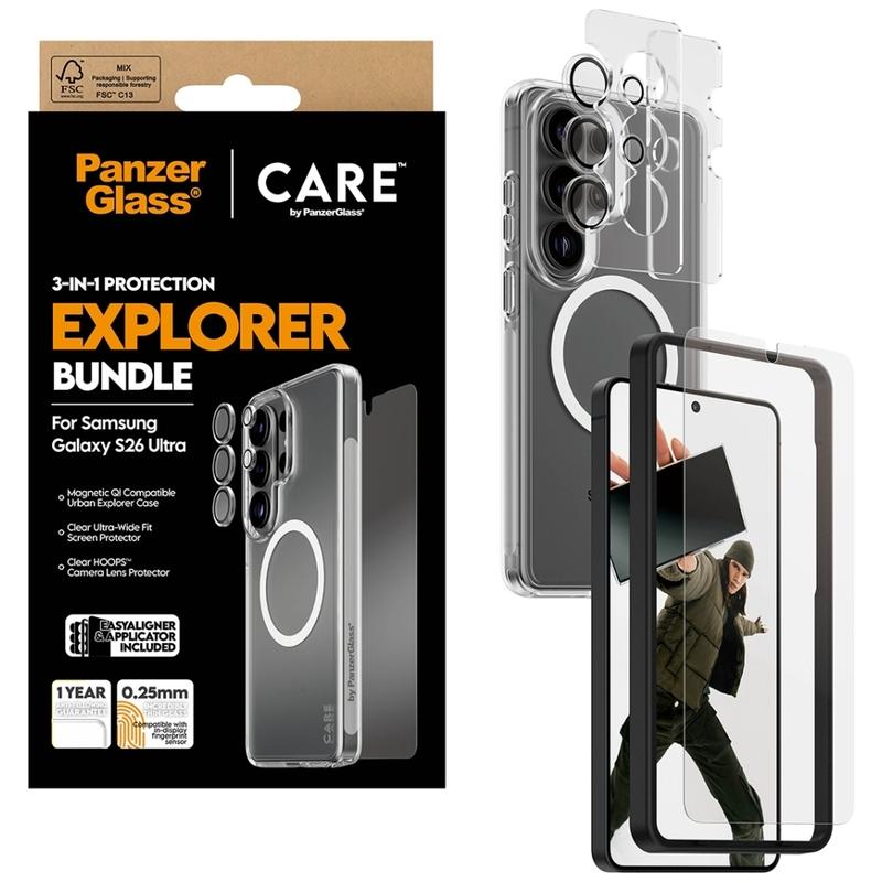 Ge din Samsung Galaxy S26 Ultra komplett skydd på en gång med CARE by PanzerGlass 3-i-1 Explorer Bundle. Detta allt-i-ett-set kombinerar ett Ultra-Wide Fit-skärmskydd, ett transparent kameraskydd och ett tåligt transparent skal, så att din telefon är skyddad från frontglaset till kameramodulen och baksidan. Det är byggt för vardagslivet i stan och helgens äventyr och är utformat för att klara fall, repor och stötar samtidigt som telefonens ursprungliga design förblir synlig.