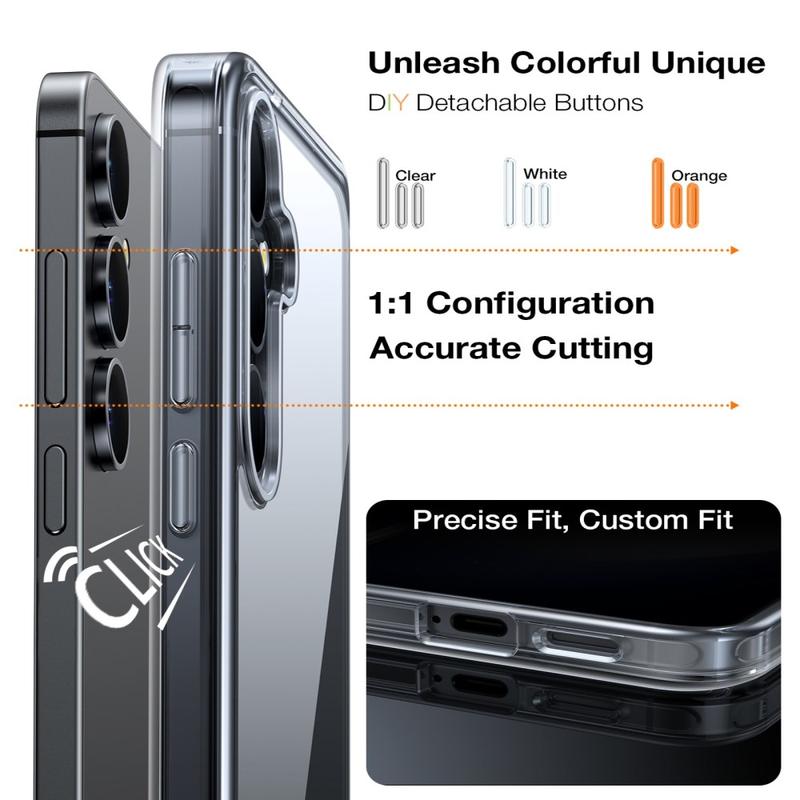 Skalet innehåller tre färguppsättningar med utbytbara knappar, vilket gör att du kan anpassa utseendet på din Samsung Galaxy S26+. Byt enkelt ut knapparna för att matcha din stil, outfit eller humör och skapa ett unikt, anpassat utseende.