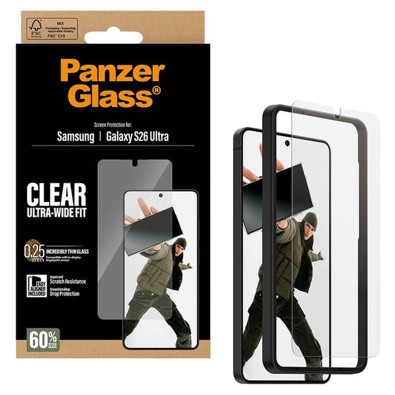 - Ultra-Wide Fit skärmskydd i härdat glas till Samsung Galaxy S26 Ultra av PanzerGlass