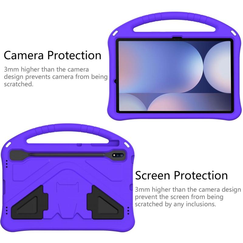 Det är tillverkat av stöttåligt, miljövänligt och giftfritt EVA-material och har förstärkta hörn och upphöjda kanter som skyddar skärmen från repor och skador. Stativet på baksidan av detta fantastiska skal till Samsung Galaxy Tab S10+ möjliggör bekvämt handsfree-tittande medan bärhandtaget gör skalet mer praktiskt och spännande för barnen.