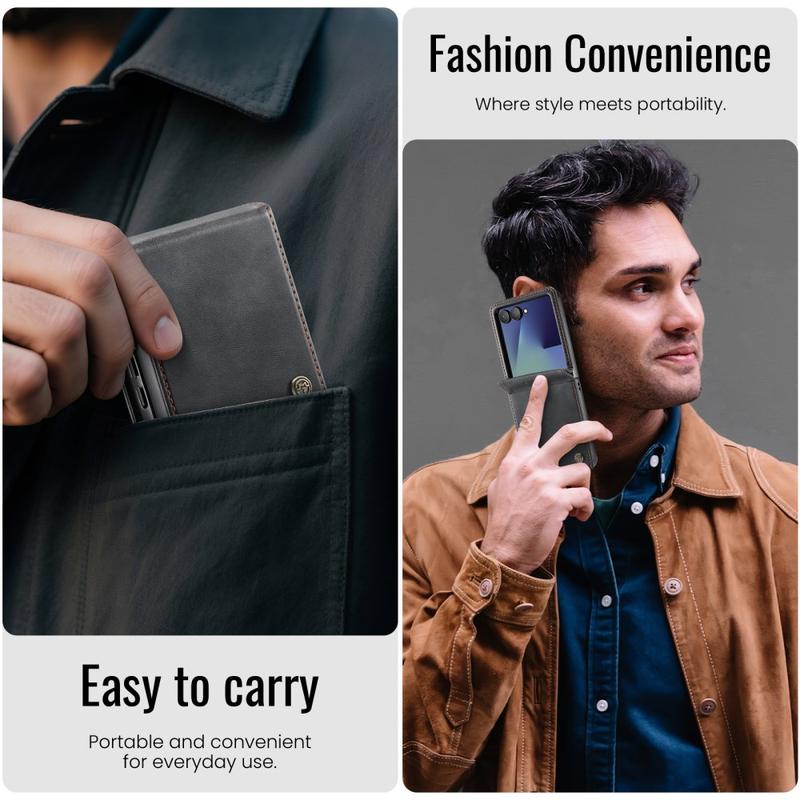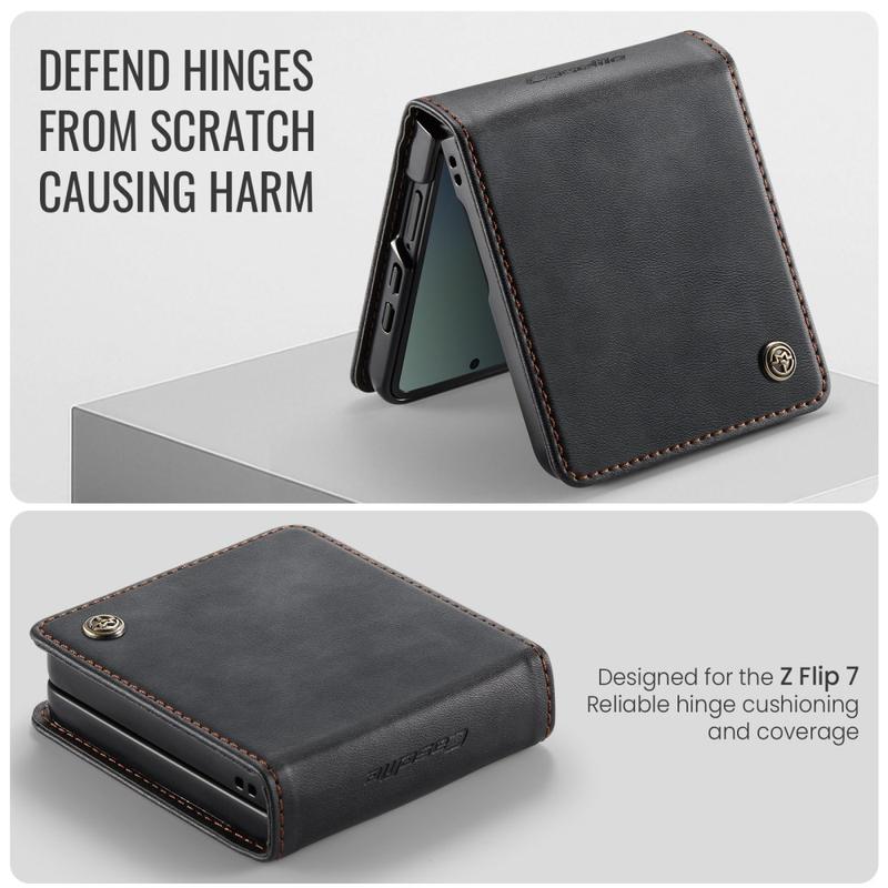 CASEME 033-seriens plånboksfodral för Samsung Galaxy Z Flip7 är tillverkat av polyuretan med kalvstruktur i kombination med TPU, vilket ger ett heltäckande skydd mot repor, stötar och dagligt slitage samtidigt som det bibehåller ett förstklassigt och elegant utseende.