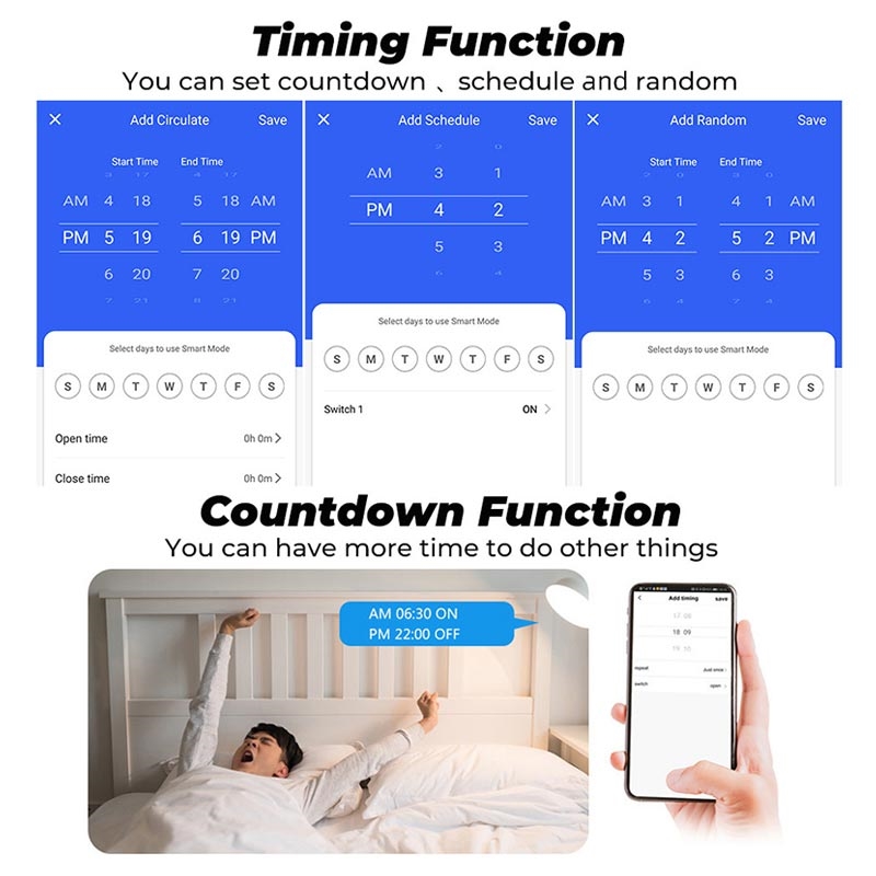Skapa personliga rutiner – till exempel slå på vardagsrumsfläkten vid soluppgång eller stäng av ditt barns nattlampa automatiskt vid sänggåendet. Nedräkningstimern och "ställ in och glöm"-funktionerna säkerställer att du aldrig behöver oroa dig för att lämna enheter igång igen.