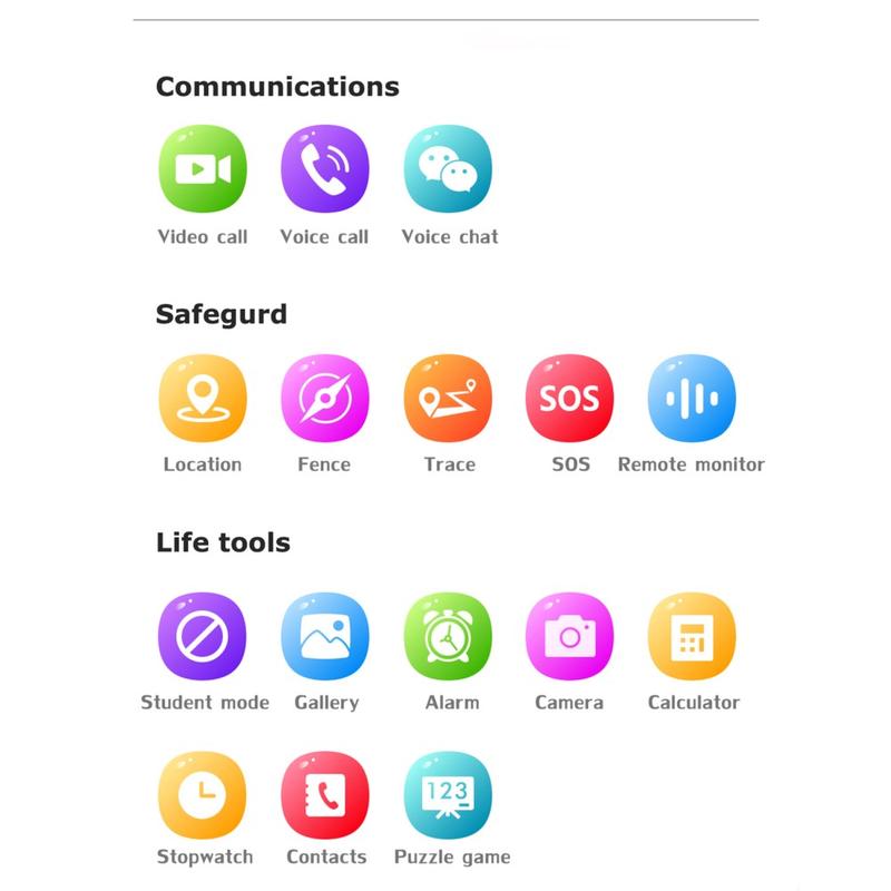 Den 1,4 tum stora IPS-pekskärmen erbjuder en tydlig och färgstark bild, medan kombinationen av GPS, WiFi och LBS-positionering bidrar till en mer exakt positionsbestämning. Med stöd för röstsamtal, videosamtal, fjärrövervakning och internetåtkomst via WiFi och 4G hjälper klockan barn att hålla kontakten hela dagen. Den inbyggda stegräknaren uppmuntrar också till mer aktiva dagliga vanor, och det mjuka armbandet i livsmedelsklassad silikon är utformat för bekvämt dagligt bruk.