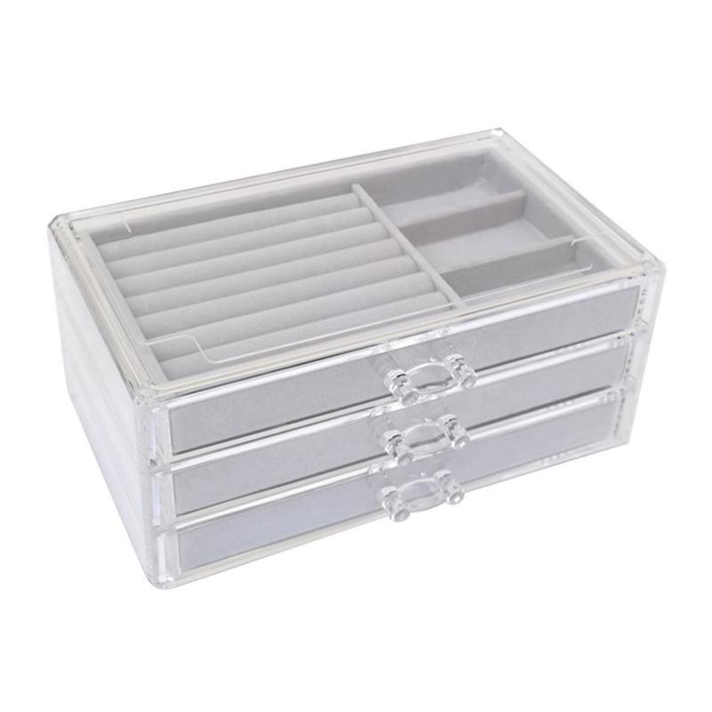 Håll din smyckessamling vackert organiserad och skyddad med detta eleganta 3-lagers smyckesskrin. Tillverkad av premiumakryl, slitstark kartong och fodrad med mjuk sammet, förhindrar detta smyckeskrin repor och skador samtidigt som det visar upp din smyckeskollektion tydligt och attraktivt. Med löstagbara brickor och lådor anpassar sig detta smyckeskrin enkelt till dina förvaringsbehov.